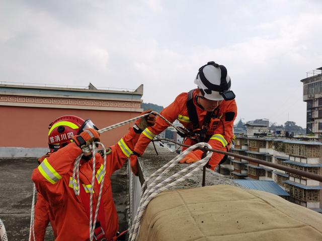 13时04分,救援人员到达现场,经侦查现场为一名11岁的男生跨坐在教室四楼的窗户边上,情绪十分激动,眼看情况危急。根据现场情况,两名救援人员快速在一楼铺设救生气垫,其余救援人员来到男生所在班级门口试图进行劝说。不论怎么劝,男生都坚持不下来。救援人员立即下达救援指令:4人利用绳索救援技术固定天台水泥墩,从天台坐息悬垂至男生附近窗台,一名救援人员为了避免引起男生警惕,着蓝色的体能训练服在二楼随时观察,做好救援准备;同时一楼3人及时观察窗口的情况,确保救生气垫正常工作。