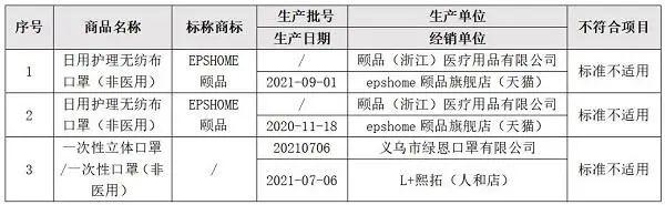 “颐品”等3款样品标准不适用