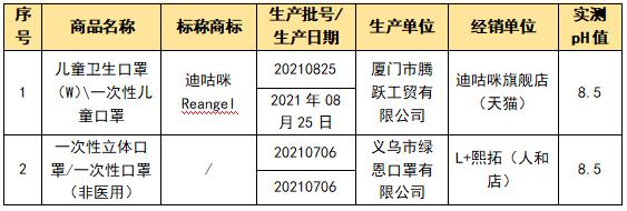 GB/T 3880-2020《儿童口罩技术规范》要求儿童口罩pH值应在4.0~7.5之间,有2款样品的pH值超出此范围,不建议儿童佩戴。标称商品涉及“迪咕咪Reangel”: